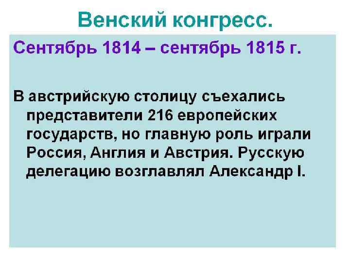 Венский конгресс – общеевропейская конференция, в ходе которой была выработана система договоров, направленных на восстановление феодальноабсолютистских монархий, разрушенных французской революцией 1789 года и наполеоновскими войнами, и были определены новые границы государств Европы. В конгрессе, проходившем в Вене с сентября 1814 по июнь 1815 г. под председательством австрийского дипломата графа Меттерниха, участвовали представители всех стран Европы (кроме Османской империи).