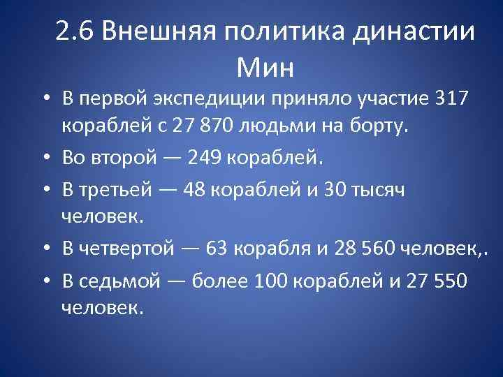 2. 6 Внешняя политика династии Мин • В первой экспедиции приняло участие 317 кораблей с 27 870 людьми на борту. • Во второй — 249 кораблей. • В третьей — 48 кораблей и 30 тысяч человек. • В четвертой — 63 корабля и 28 560 человек, . • В седьмой — более 100 кораблей и 27 550 человек.