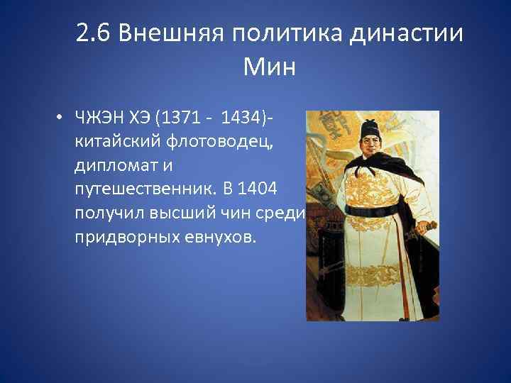 2. 6 Внешняя политика династии Мин • ЧЖЭН ХЭ (1371 - 1434)китайский флотоводец, дипломат и путешественник. В 1404 получил высший чин среди придворных евнухов.