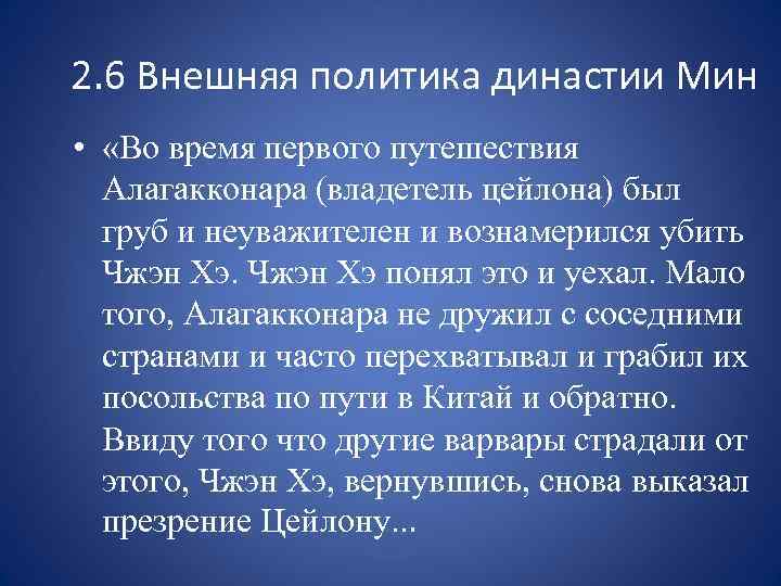 2. 6 Внешняя политика династии Мин • «Во время первого путешествия Алагакконара (владетель цейлона) был груб и неуважителен и вознамерился убить Чжэн Хэ понял это и уехал. Мало того, Алагакконара не дружил с соседними странами и часто перехватывал и грабил их посольства по пути в Китай и обратно. Ввиду того что другие варвары страдали от этого, Чжэн Хэ, вернувшись, снова выказал презрение Цейлону. . .