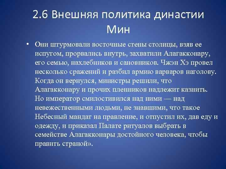 2. 6 Внешняя политика династии Мин • Они штурмовали восточные стены столицы, взяв ее испугом, прорвались внутрь, захватили Алагакконару, его семью, нахлебников и сановников. Чжэн Хэ провел несколько сражений и разбил армию варваров наголову. Когда он вернулся, министры решили, что Алагакконару и прочих пленников надлежит казнить. Но император смилостивился над ними — над невежественными людьми, не знавшими, что такое Небесный мандат на правление, и отпустил их, дав еду и одежду, и приказал Палате ритуалов выбрать в семействе Алагакконары достойного человека, чтобы править страной» .