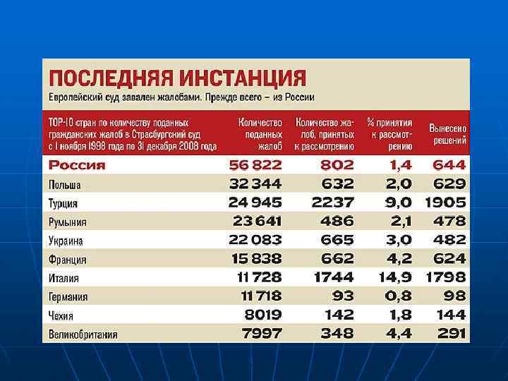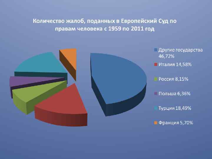 Решения, вынесенные ЕСПЧ в отношении России с 1998 по 2011 годы Всего постановлено 1212 решений, в том числе: Установлено хотя бы одно нарушение прав человека 1140 Не установлено нарушений прав человека 49 Достигнуто мирное урегулирование 13 Принято другое решение (дело заявителя было пересмотрено, ему выплачена справедливая компенсация государством-ответчиком) 10