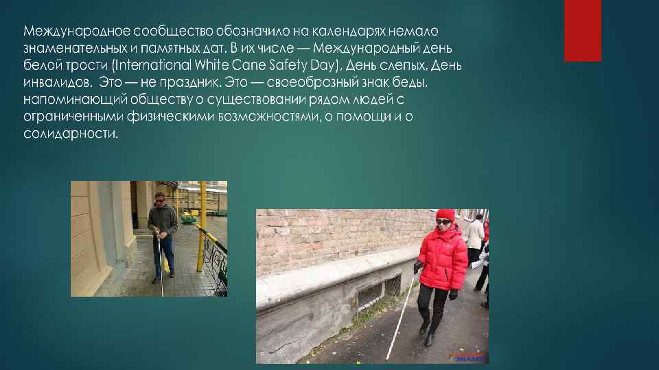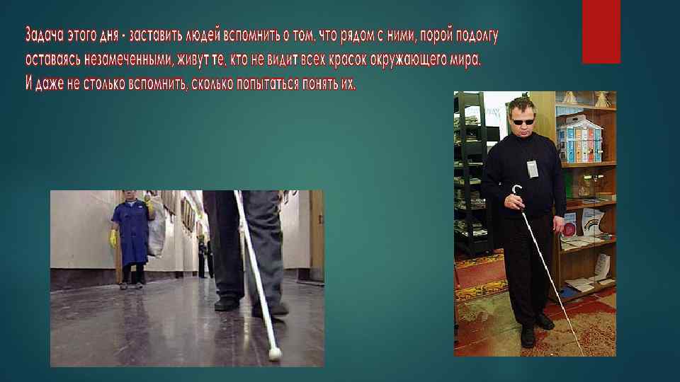 Международный день белой трости - это попытка уравнять в правах инвалидов и условно здоровых, позволить первым почувствовать себя полноценными, а вторым - примерить на себя участь человека с физическим недостатком. И, как итог, понять и принять друга такими, какие они есть: со всеми достоинствами, отрицательными и положительными сторонами характера, сложностями и спецификой.