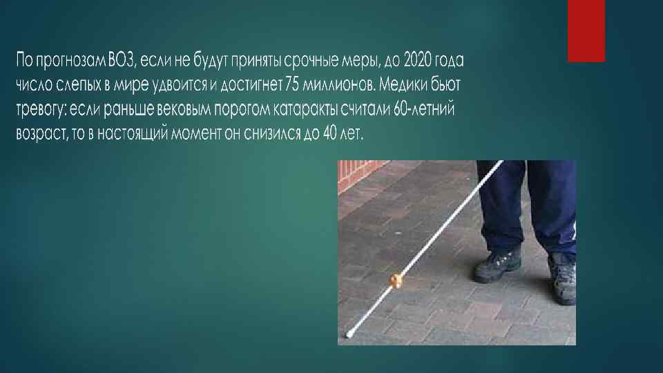 По данным Всемирной организации здравоохранения (ВОЗ), во всем мире насчитывается около 37 миллионов слепых людей и 124 миллиона лиц с плохим зрением. Каждые пять секунд в мире слепнет один взрослый человек, каждую минуту - ребенок. При этом три четверти случаев слепоты можно вылечить или предотвратить.