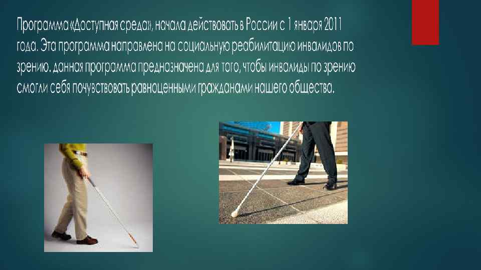 с 2010 года, начата реализация мероприятий, направленных на трудоустройство граждан с ограниченными возможностями. Это касается не только слабовидящих или незрячих, это относится и в принципе к маломобильным группам населения. В 2010 году, в России начал функционировать единый социальный телефон Министерства здравоохранения и социального развития РФ 8 -800 -555 -0 -222.