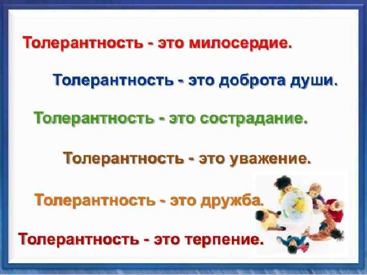 «Толерантность» - это уважение, принятие и понимание богатого многообразия культур нашего мира, уважение традиций и вероисповеданий других народов, моральный долг, политическая и правовая потребность (Декларация принципов толерантности. Утверждена резолюцией 5. 61 генеральной конференции ЮНЕСКО от 16 ноября 1995 года)