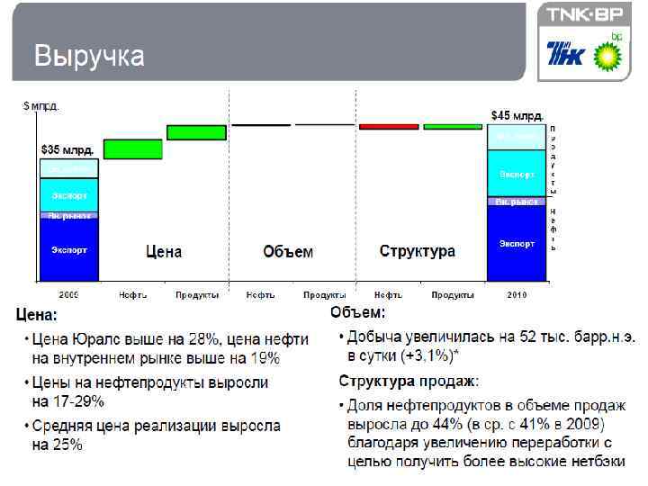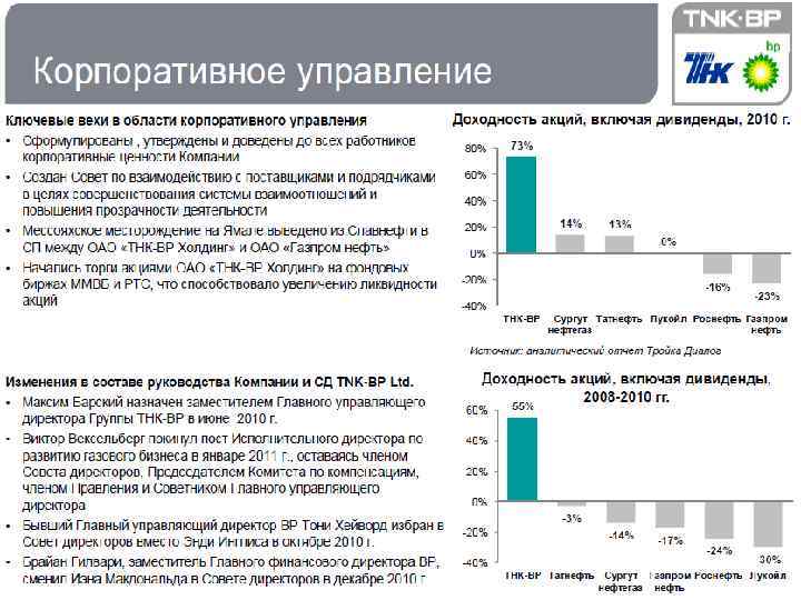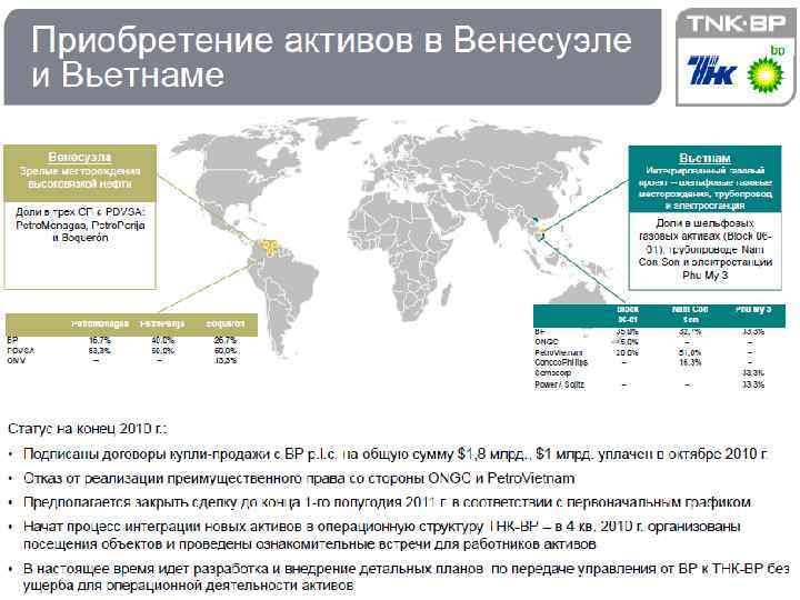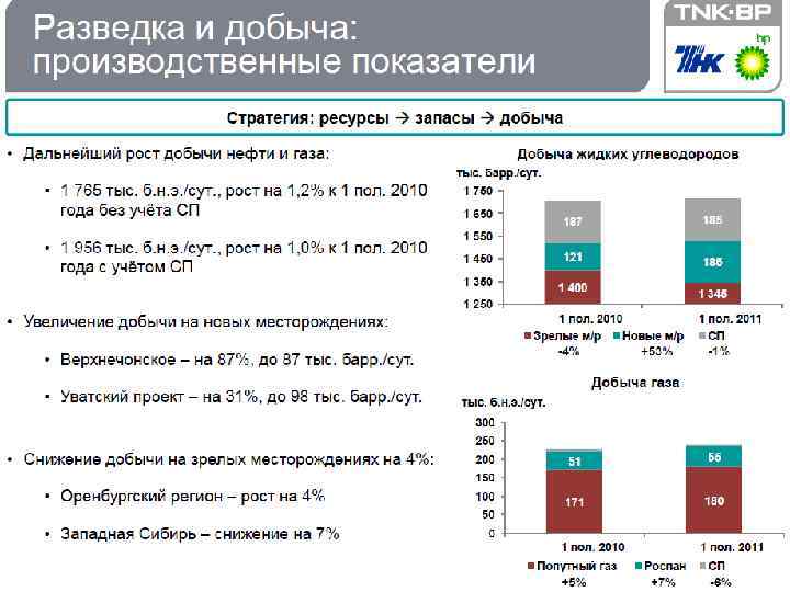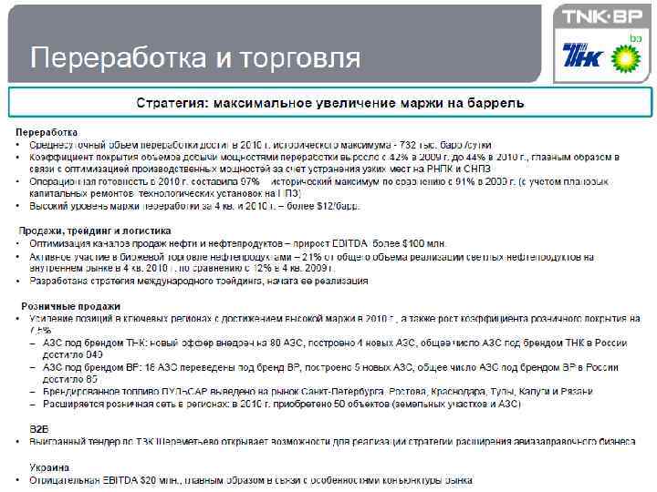 О компании • Компания была образована в 2003 году в результате слияния нефтяных и году газовых активов компании BP в России и нефтегазовых активов консорциума Альфа, Аксесс/Ренова (ААР). • ТНК-ВР является одной из ведущих нефтяных компаний России и входит ТНК-ВР в десятку крупнейших частных нефтяных компаний в мире по объемам добычи нефти. • ВР и ААР владеют компанией ТНК-ВР на паритетной основе. Акционерам ТНК-ВР также принадлежит около 50% акций нефтяной компании «Славнефть» . • ТНК-ВР — вертикально интегрированная нефтяная компания, в портфеле которой ряд добывающих, перерабатывающих и сбытовых предприятий в России и Украине. • Добывающие активы компании расположены, в основном, в Западной Сибири (Ханты-Мансийский и Ямало-Ненецкий автономные округа, Тюменская область), Восточной Сибири (Иркутская область) и Волго. Уральском регионе (Оренбургская область).