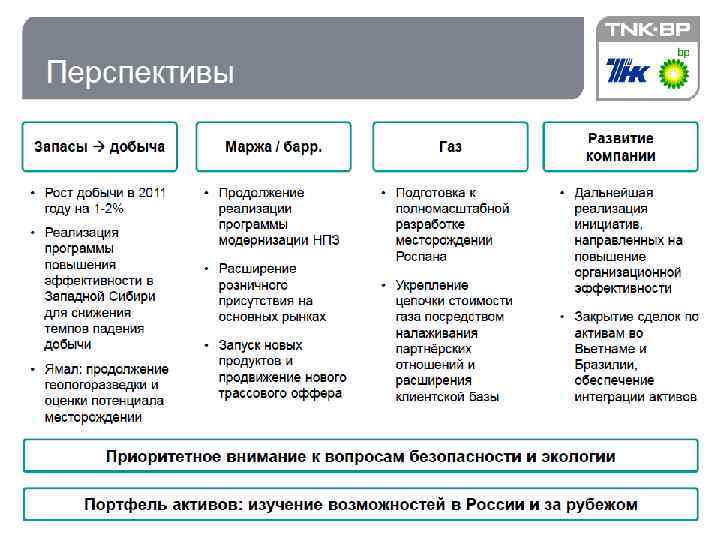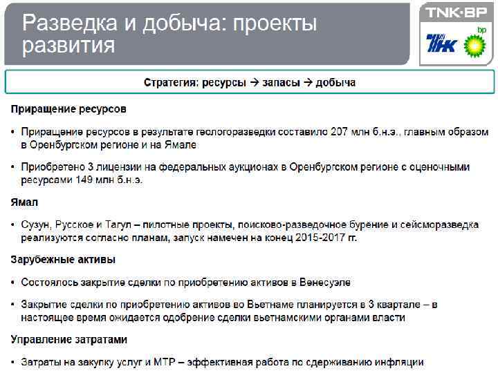 Стратегия Стратегическая цель ТНК -ВР – стать компанией международного уровня, лидером среди частных нефтяных компаний России – основана на трех основополагающих предпосылках: C международной диверсификации (восполнение ресурсной базы и развитие газового бизнеса), C передовой технологии C сильном организационном потенциале. ТНК -ВР инвестирует в международные проекты с уровнем доходности, -ВР который благоприятно скажется на финансовых результатах, работа на международных рынках повысит стандарты корпоративного управления, а коллектив компании приобретет новые знания, укрепив при этом конкурентоспособность.