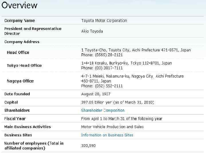 Toyota Motor Corporation (TMC) крупнейшая японская автомобилестроительная корпорация, также предоставляющая финансовые услуги и имеющая несколько дополнительных направлений в бизнесе. Компания занимает 5 место в Fortune Global 500 (2010 год).