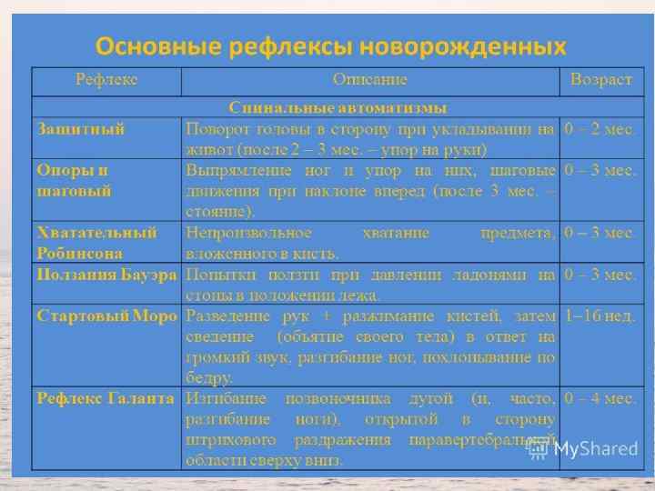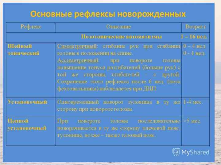 Заключение • Бывает так, что некоторые рефлексы у малыша включаются с опозданием или проявляются не очень отчетливо. Это может быть связано с травмой, полученной во время родов, при болезнях, а также оказаться индивидуальной реакцией на определенные лекарства. • Также слабость оральных и спинальных реакций обычно отмечается у недоношенных детей и у тех, кто родился с легкой асфиксией. • Интересно, что слабые рефлексы у новорожденного ребенка, связанные с поиском еды и ее поглощением (сосание и глотание), могут объясняться всего лишь тем, что малыш просто не голоден. Наиболее отчетливо они проявляются перед кормлением.