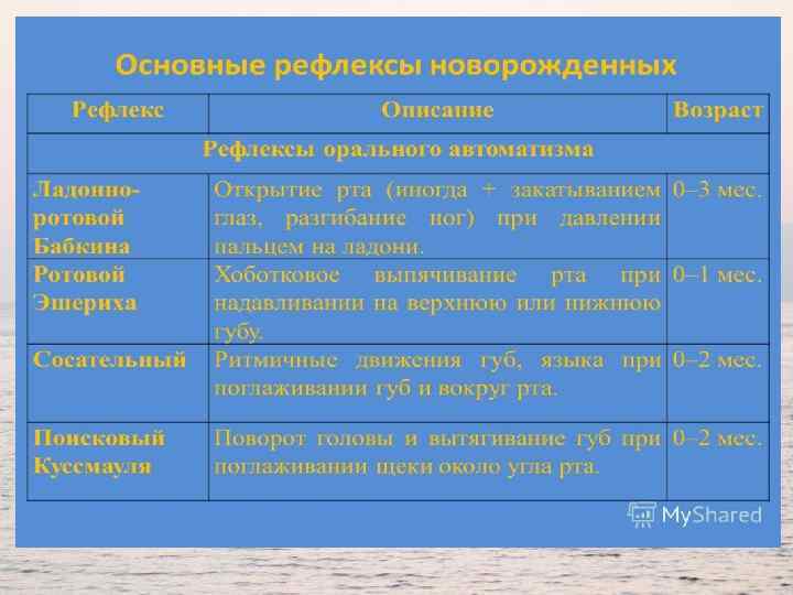 Основные рефлексы Оральные рефлексы • Способность сосать материнскую грудь или соску на бутылочке с искусственным питанием называется сосательным рефлексом, а способность проглотить съеденную пищу – глотательным. • Сосательный рефлекс возникает в первые часы жизни и сохраняется до года: малыш обхватывает губами сосок, рожок бутылочки и ритмично их посасывает – примерно так с точки зрения физиологии выглядит обычный процесс кормления. Подробно о сосательном рефлексе • Глотательный рефлекс остается на всю жизнь. • Хоботковый рефлекс – еще одна разновидность оральных рефлексов. Если легко коснуться губ малыша, они смешно выпячиваются в трубочку – совсем как хобот у слоненка, потому что в этот момент непроизвольно сокращается круговая мышца рта. Пропадает хоботковый рефлекс к двумтрем месяцам.