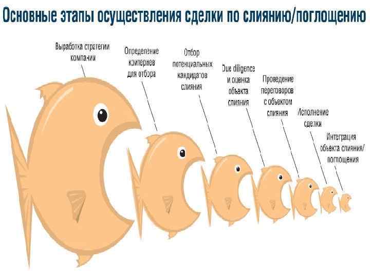 Слияние и поглощение (сделка M&A, англ. Mergers and acquisitions) представляет собой экономический процесс укрупнения бизнеса (покупка акций) и увеличения (объединения) активов. Слияние — это возникновение новой компании в результате совокупления двух равнозначных компаний, поглощение — это выкуп поглощаемой компании компанией-поглотителем, в результате чего поглощенная компания перестает существовать, а поглотитель увеличивается Слияния и поглощения 71