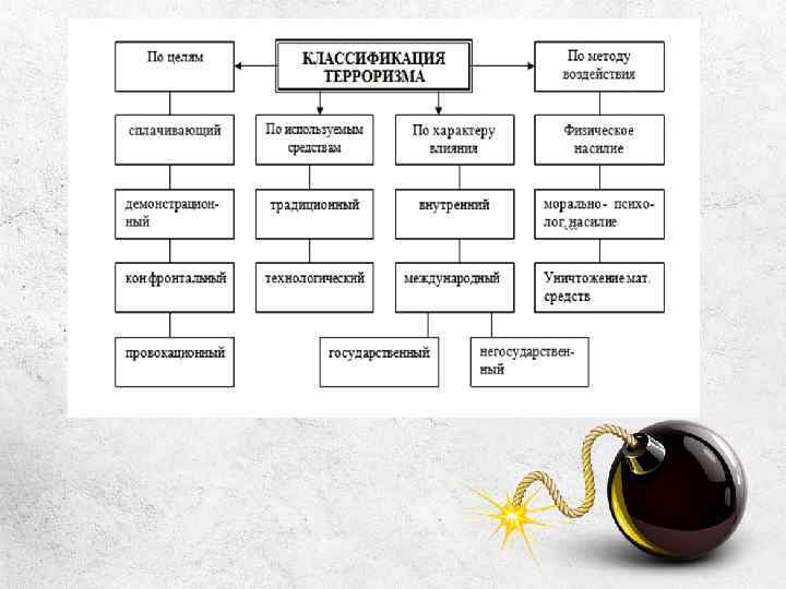 В зависимости от того, против кого направлен террор и какие перед ним поставлены цели, терроризм может подразделяться на: • • политический, криминальный, экономический, националистический, виртуальный, психологический, международный.