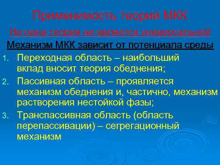 Применимость теорий МКК Ни одна теория не является универсальной Механизм МКК зависит от потенциала среды 1. Переходная область – наибольший вклад вносит теория обеднения; 2. Пассивная область – проявляется механизм обеднения и, частично, механизм растворения нестойкой фазы; 3. Транспассивная область (область перепассивации) – сегрегационный механизм