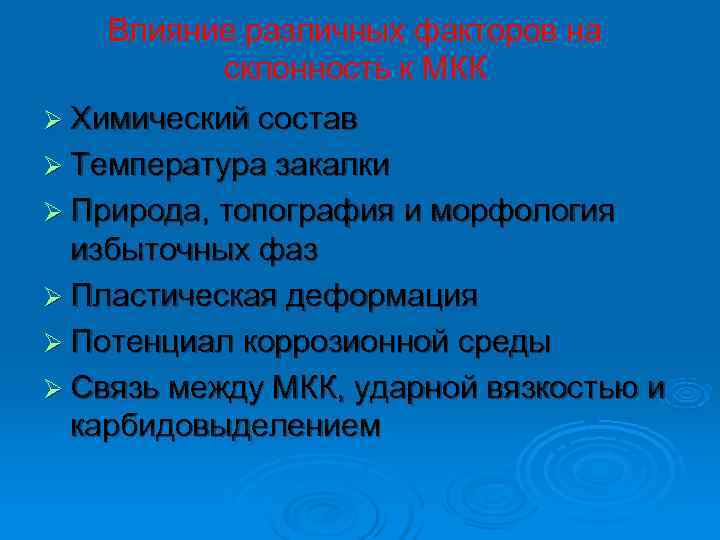 Влияние различных факторов на склонность к МКК Ø Химический состав Ø Температура закалки Ø Природа, топография и морфология избыточных фаз Ø Пластическая деформация Ø Потенциал коррозионной среды Ø Связь между МКК, ударной вязкостью и карбидовыделением