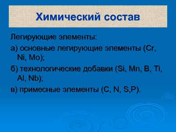 Химический состав Легирующие элементы: а) основные легирующие элементы (Cr, Ni, Mo); б) технологические добавки (Si, Mn, B, Ti, Al, Nb); в) примесные элементы (C, N, S, P).