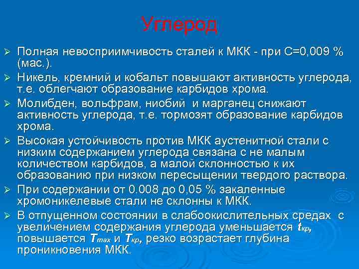 Углерод Ø Полная невосприимчивость сталей к МКК - при С=0, 009 % (мас. ). Ø Никель, кремний и кобальт повышают активность углерода, т. е. облегчают образование карбидов хрома. Ø Молибден, вольфрам, ниобий и марганец снижают активность углерода, т. е. тормозят образование карбидов хрома. Ø Высокая устойчивость против МКК аустенитной стали с низким содержанием углерода связана c не малым количеством карбидов, а малой склонностью к их образованию при низком пересыщении твердого раствора. Ø При содержании от 0. 008 до 0, 05 % закаленные хромоникелевые стали не склонны к МКК. Ø В отпущенном состоянии в слабоокислительных средах с увеличением содержания углерода уменьшается tкр, повышается Тmax и Ткр, резко возрастает глубина проникновения МКК.