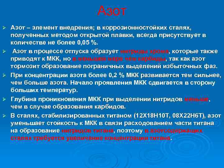 Азот Ø Азот – элемент внедрения; в коррозионностойких сталях, полученных методом открытой плавки, всегда присутствует в количестве не более 0, 05 %. Ø Азот в процессе отпуска образует нитриды хрома, которые также приводят к МКК, но в меньшей мере чем карбиды, так как азот тормозит образование пограничных выделений избыточных фаз. Ø При концентрации азота более 0, 2 % МКК развивается тем сильнее, чем больше азота. Начало проявления МКК сдвигается в сторону больших температур. Ø Глубина проникновения МКК при выделении нитридов меньше, чем в случае образования карбидов. Ø В сталях, стабилизированных титаном (12 Х 18 Н 10 Т, 08 Х 22 Н 6 Т), азот уменьшает стойкость к МКК в связи расходованием части титана на образование нитридов титана, поэтому в азотсодержащих сталях требуется увеличение концентрации титана.