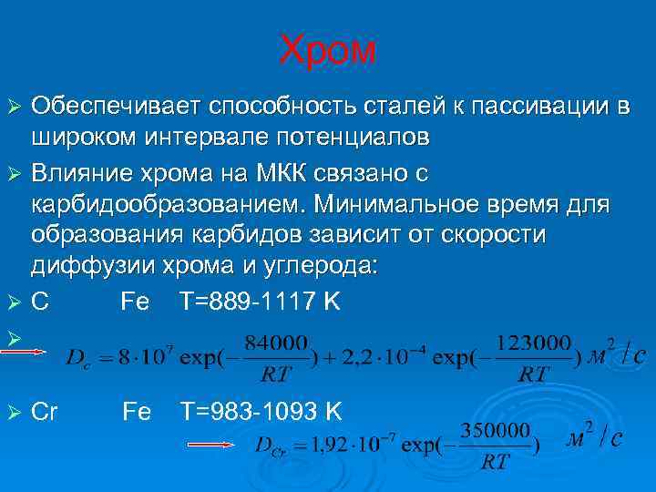 Хром Ø Обеспечивает способность сталей к пассивации в широком интервале потенциалов Ø Влияние хрома на МКК связано с карбидообразованием. Минимальное время для образования карбидов зависит от скорости диффузии хрома и углерода: Ø С Fe T=889 -1117 K Ø Ø Cr Fe T=983 -1093 K