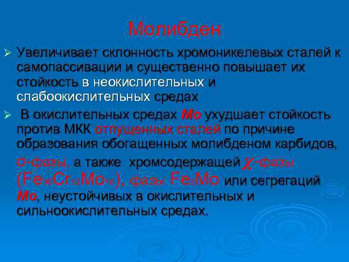 Молибден Ø Увеличивает склонность хромоникелевых сталей к самопассивации и существенно повышает их стойкость в неокислительных и слабоокислительных средах Ø В окислительных средах Мо ухудшает стойкость против МКК отпущенных сталей по причине образования обогащенных молибденом карбидов, σ-фазы, а также хромсодержащей χ-фазы (Fe 36 Cr 12 Mo 16), фазы Fe 2 Mo или сегрегаций Мо, неустойчивых в окислительных и сильноокислительных средах.