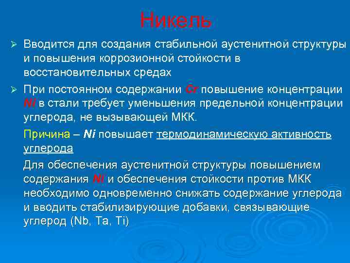 Никель Ø Вводится для создания стабильной аустенитной структуры и повышения коррозионной стойкости в восстановительных средах Ø При постоянном содержании Cr повышение концентрации Ni в стали требует уменьшения предельной концентрации углерода, не вызывающей МКК. Причина – Ni повышает термодинамическую активность углерода Для обеспечения аустенитной структуры повышением содержания Ni и обеспечения стойкости против МКК необходимо одновременно снижать содержание углерода и вводить стабилизирующие добавки, связывающие углерод (Nb, Ta, Ti)