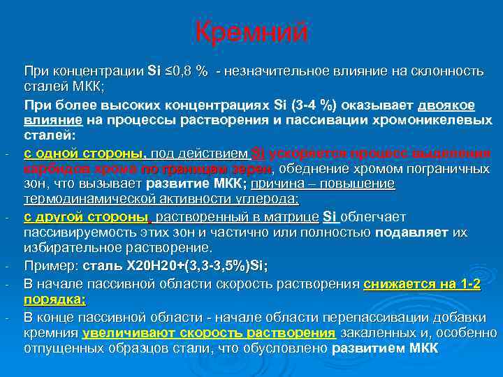 Кремний При концентрации Si ≤ 0, 8 % - незначительное влияние на склонность сталей МКК; При более высоких концентрациях Si (3 -4 %) оказывает двоякое влияние на процессы растворения и пассивации хромоникелевых сталей: - с одной стороны, под действием Si ускоряется процесс выделения карбидов хрома по границам зерен, обеднение хромом пограничных зон, что вызывает развитие МКК; причина – повышение термодинамической активности углерода; - с другой стороны, растворенный в матрице Si облегчает пассивируемость этих зон и частично или полностью подавляет их избирательное растворение. - Пример: сталь Х 20 Н 20+(3, 3 -3, 5%)Si; - В начале пассивной области скорость растворения снижается на 1 -2 порядка; - В конце пассивной области - начале области перепассивации добавки кремния увеличивают скорость растворения закаленных и, особенно отпущенных образцов стали, что обусловлено развитием МКК