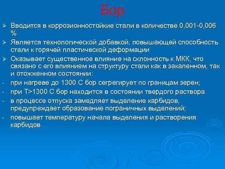 Бор Ø Вводится в коррозионностойкие стали в количестве 0, 001 -0, 006 % Ø Является технологической добавкой, повышающей способность стали к горячей пластической деформации Ø Оказывает существенное влияние на склонность к МКК, что связано с его влиянием на структуру стали как в закаленном, так и отожженном состоянии: - при нагреве до 1300 С бор сегрегирует по границам зерен; - при Т>1300 С бор находится в состоянии твердого раствора - в процессе отпуска замедляет выделение карбидов, предупреждает образование пограничных выделений; - повышает температуру начала выделения и растворения карбидов