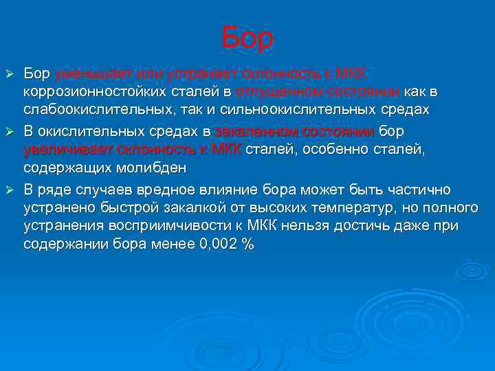Бор Ø Бор уменьшает или устраняет склонность к МКК коррозионностойких сталей в отпущенном состоянии как в слабоокислительных, так и сильноокислительных средах Ø В окислительных средах в закаленном состоянии бор увеличивает склонность к МКК сталей, особенно сталей, содержащих молибден Ø В ряде случаев вредное влияние бора может быть частично устранено быстрой закалкой от высоких температур, но полного устранения восприимчивости к МКК нельзя достичь даже при содержании бора менее 0, 002 %