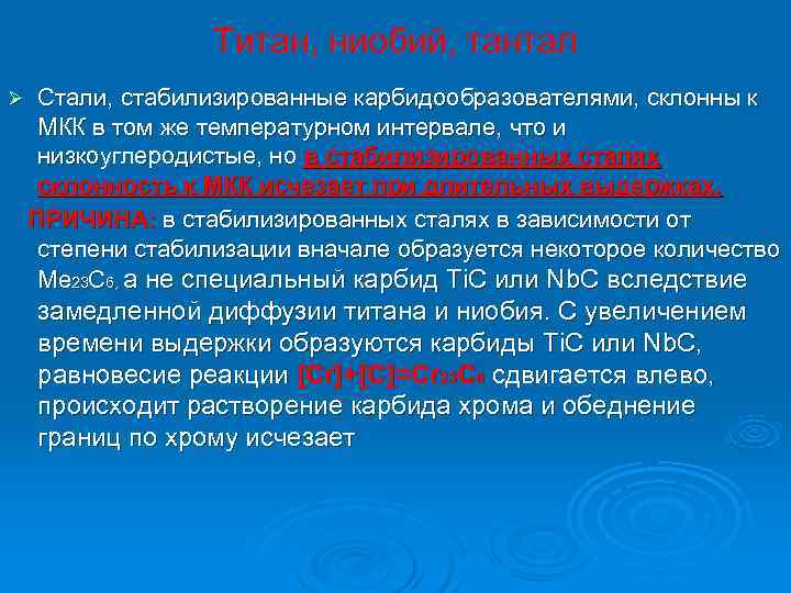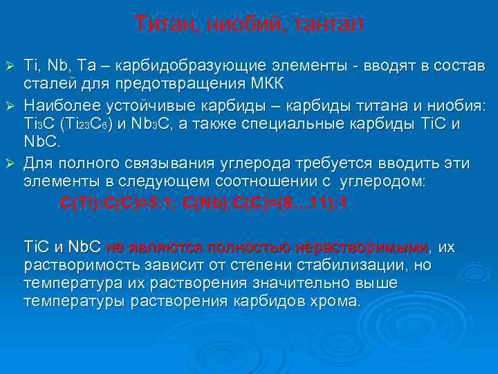 Титан, ниобий, тантал Ø Ti, Nb, Ta – карбидобразующие элементы - вводят в состав сталей для предотвращения МКК Ø Наиболее устойчивые карбиды – карбиды титана и ниобия: Ti 3 C (Тi 23 C 6) и Nb 3 C, а также специальные карбиды Ti. C и Nb. C. Ø Для полного связывания углерода требуется вводить эти элементы в следующем соотношении с углеродом: С(Ti): C(C)=5: 1; C(Nb): C(C)=(8… 11): 1 Ti. C и Nb. C не являются полностью нерастворимыми, их растворимость зависит от степени стабилизации, но температура их растворения значительно выше температуры растворения карбидов хрома.