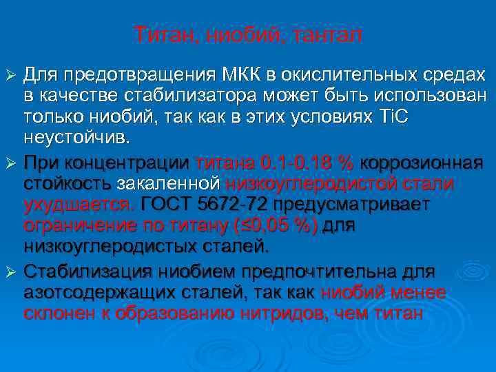 Титан, ниобий, тантал Ø Для предотвращения МКК в окислительных средах в качестве стабилизатора может быть использован только ниобий, так как в этих условиях Ti. C неустойчив. Ø При концентрации титана 0. 1 -0. 18 % коррозионная стойкость закаленной низкоуглеродистой стали ухудшается. ГОСТ 5672 -72 предусматривает ограничение по титану (≤ 0, 05 %) для низкоуглеродистых сталей. Ø Стабилизация ниобием предпочтительна для азотсодержащих сталей, так как ниобий менее склонен к образованию нитридов, чем титан
