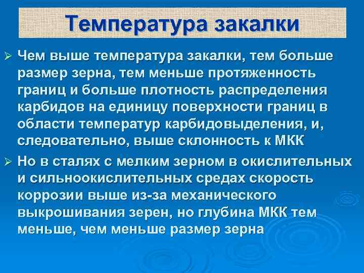 Температура закалки Ø Чем выше температура закалки, тем больше размер зерна, тем меньше протяженность границ и больше плотность распределения карбидов на единицу поверхности границ в области температур карбидовыделения, и, следовательно, выше склонность к МКК Ø Но в сталях с мелким зерном в окислительных и сильноокислительных средах скорость коррозии выше из-за механического выкрошивания зерен, но глубина МКК тем меньше, чем меньше размер зерна