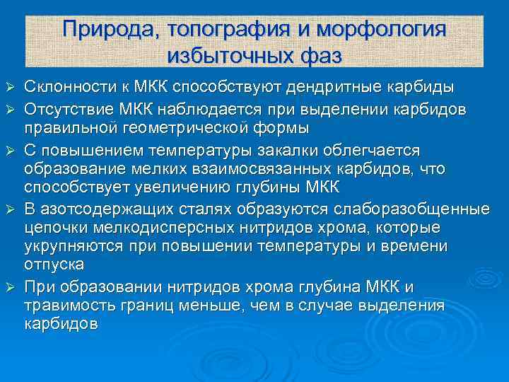 Природа, топография и морфология избыточных фаз Ø Склонности к МКК способствуют дендритные карбиды Ø Отсутствие МКК наблюдается при выделении карбидов правильной геометрической формы Ø С повышением температуры закалки облегчается образование мелких взаимосвязанных карбидов, что способствует увеличению глубины МКК Ø В азотсодержащих сталях образуются слаборазобщенные цепочки мелкодисперсных нитридов хрома, которые укрупняются при повышении температуры и времени отпуска Ø При образовании нитридов хрома глубина МКК и травимость границ меньше, чем в случае выделения карбидов