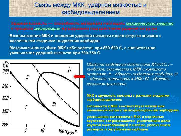 Связь между МКК, ударной вязкостью и карбидовыделением Ударная вязкость — способность материала поглощать механическую энергию в процессе деформации и разрушения под действием ударной нагрузки. Возникновение МКК и снижение ударной вязкости после отпуска связано с различными стадиями выделения карбидов. Максимальная глубина МКК наблюдается при 550 -600 С, а значительное уменьшение ударной вязкости при 700 -750 С Области выделения стали типа Х 16 Н 15: I – карбидов, склонности к МКК и хрупкости аустенит; II – область выделения карбидов; III – область склонности к МКК; IV – область развития хрупкости МКК и хрупкость связаны с разными стадиями карбидовыделения: склонности к МКК соответствует вязкий или смешанный излом с мелкодисперсными карбидами. уменьшение склонности к МКК и появление хрупкости сопровождается увеличением доли хрупкой составляющей в изломе, увеличением размеров и огрублением карбидов