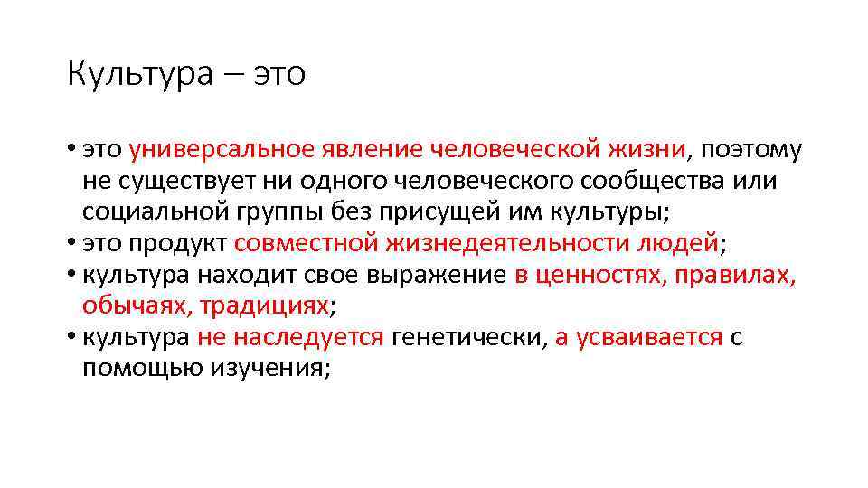 Культура – это • это универсальное явление человеческой жизни, поэтому не существует ни одного человеческого сообщества или социальной группы без присущей им культуры; • это продукт совместной жизнедеятельности людей; • культура находит свое выражение в ценностях, правилах, обычаях, традициях; • культура не наследуется генетически, а усваивается с помощью изучения;