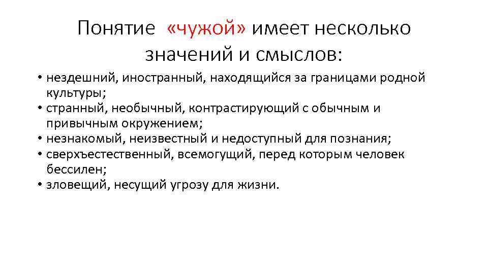 Понятие «чужой» имеет несколько значений и смыслов: • нездешний, иностранный, находящийся за границами родной культуры; • странный, необычный, контрастирующий с обычным и привычным окружением; • незнакомый, неизвестный и недоступный для познания; • сверхъестественный, всемогущий, перед которым человек бессилен; • зловещий, несущий угрозу для жизни.