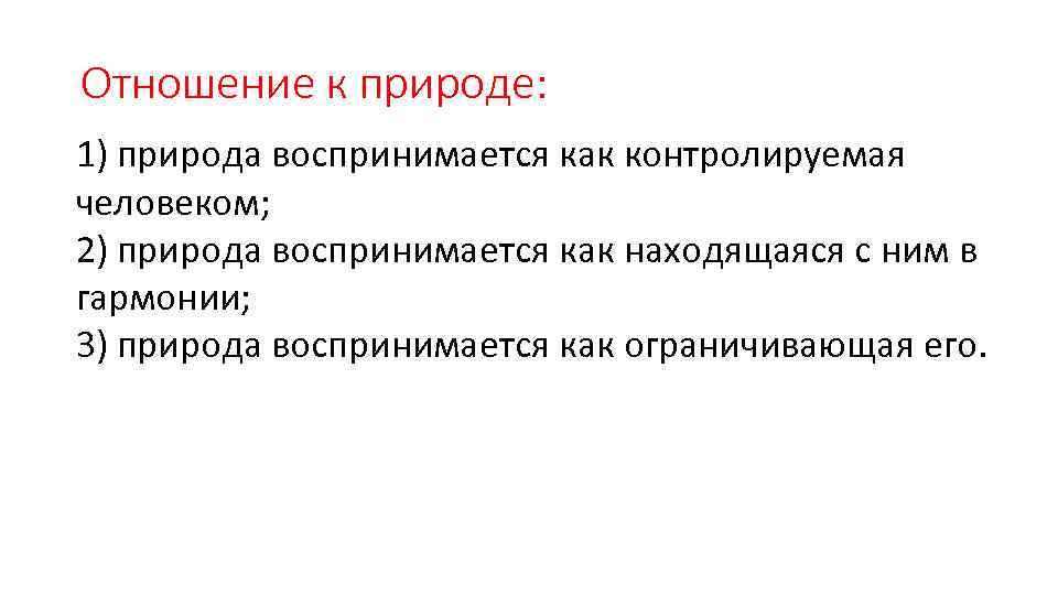 Отношение к природе: 1) природа воспринимается как контролируемая человеком; 2) природа воспринимается как находящаяся с ним в гармонии; 3) природа воспринимается как ограничивающая его.