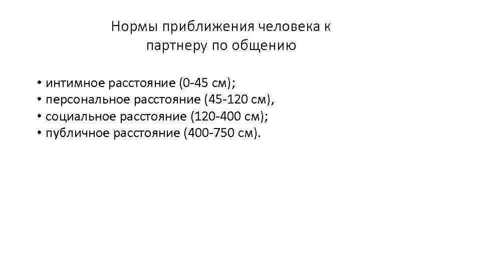 Нормы приближения человека к партнеру по общению • интимное расстояние (0 -45 см); • персональное расстояние (45 -120 см), • социальное расстояние (120 -400 см); • публичное расстояние (400 -750 см).