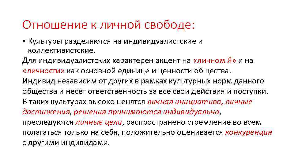Отношение к личной свободе: • Культуры разделяются на индивидуалистские и коллективистские. Для индивидуалистских характерен акцент на «личном Я» и на «личности» как основной единице и ценности общества. Индивид независим от других в рамках культурных норм данного общества и несет ответственность за все свои действия и поступки. В таких культурах высоко ценятся личная инициатива, личные достижения, решения принимаются индивидуально, преследуются личные цели, распространено стремление во всем полагаться только на себя, положительно оценивается конкуренция с другими индивидами.