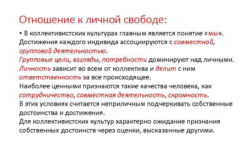 Отношение к личной свободе: • В коллективистских культурах главным является понятие «мы» . Достижения каждого индивида ассоциируются с совместной, групповой деятельностью. Групповые цели, взгляды, потребности доминируют над личными. Личность зависит во всем от коллектива и делит с ним ответственность за все происходящее. Наиболее ценными признаются такие качества человека, как сотрудничество, совместная деятельность, скромность. В этих условиях считается неприличным подчеркивать собственные достоинства и достижения. Для коллективистских культур характерно ожидание признания собственных достоинств через оценки, высказанные другими.
