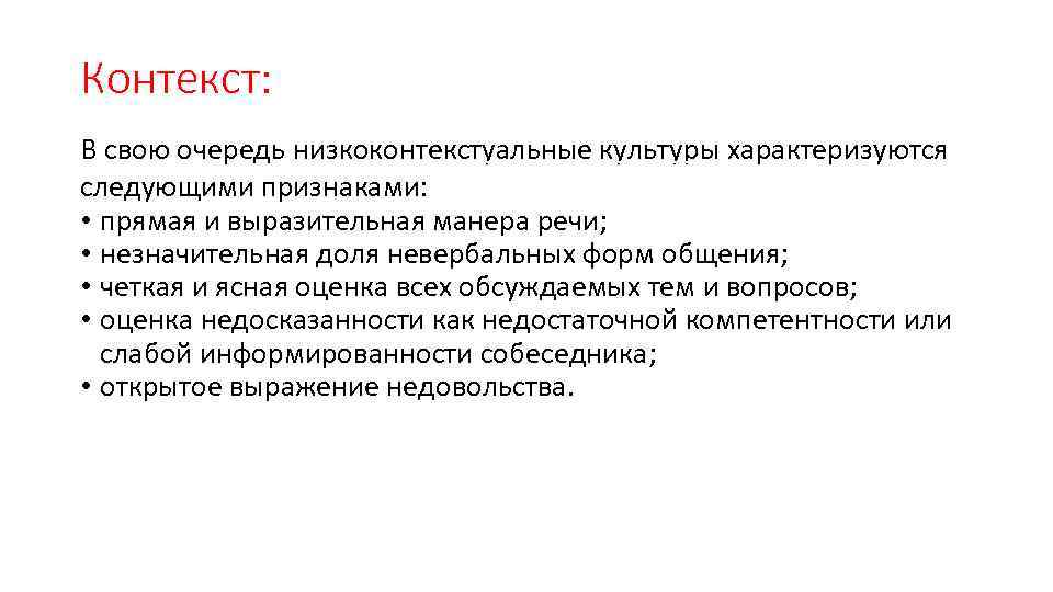 Контекст: В свою очередь низкоконтекстуальные культуры характеризуются следующими признаками: • прямая и выразительная манера речи; • незначительная доля невербальных форм общения; • четкая и ясная оценка всех обсуждаемых тем и вопросов; • оценка недосказанности как недостаточной компетентности или слабой информированности собеседника; • открытое выражение недовольства.
