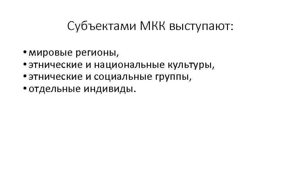 Субъектами МКК выступают: • мировые регионы, • этнические и национальные культуры, • этнические и социальные группы, • отдельные индивиды.