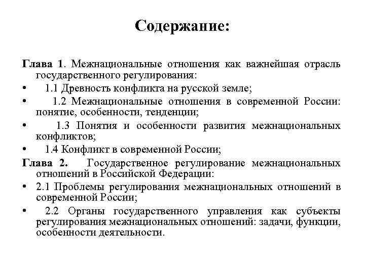 Содержание: Глава 1. Межнациональные отношения как важнейшая отрасль государственного регулирования: • 1. 1 Древность конфликта на русской земле; • 1. 2 Межнациональные отношения в современной России: понятие, особенности, тенденции; • 1. 3 Понятия и особенности развития межнациональных конфликтов; • 1. 4 Конфликт в современной России; Глава 2. Государственное регулирование межнациональных отношений в Российской Федерации: • 2. 1 Проблемы регулирования межнациональных отношений в современной России; • 2. 2 Органы государственного управления как субъекты регулирования межнациональных отношений: задачи, функции, особенности деятельности.