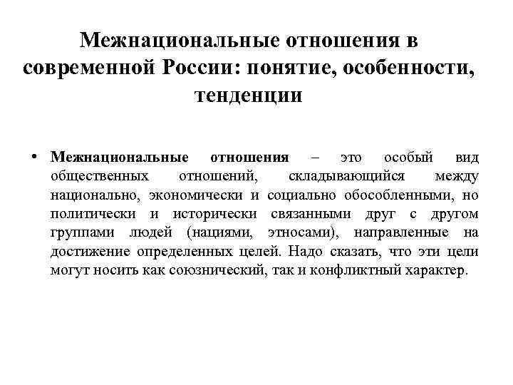 Межнациональные отношения в современной России: понятие, особенности, тенденции • Межнациональные отношения – это особый вид общественных отношений, складывающийся между национально, экономически и социально обособленными, но политически и исторически связанными друг с другом группами людей (нациями, этносами), направленные на достижение определенных целей. Надо сказать, что эти цели могут носить как союзнический, так и конфликтный характер.