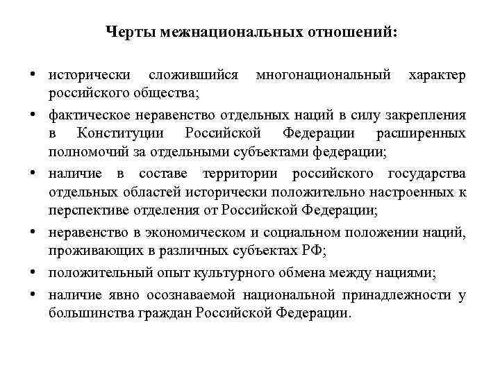 Черты межнациональных отношений: • исторически сложившийся многонациональный характер российского общества; • фактическое неравенство отдельных наций в силу закрепления в Конституции Российской Федерации расширенных полномочий за отдельными субъектами федерации; • наличие в составе территории российского государства отдельных областей исторически положительно настроенных к перспективе отделения от Российской Федерации; • неравенство в экономическом и социальном положении наций, проживающих в различных субъектах РФ; • положительный опыт культурного обмена между нациями; • наличие явно осознаваемой национальной принадлежности у большинства граждан Российской Федерации.