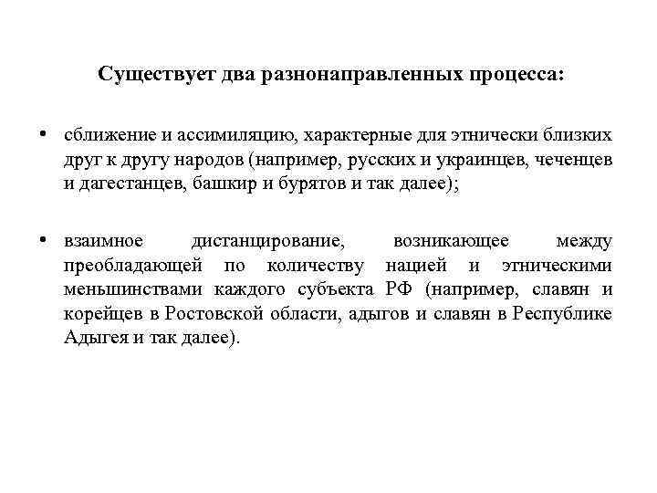 Существует два разнонаправленных процесса: • сближение и ассимиляцию, характерные для этнически близких друг к другу народов (например, русских и украинцев, чеченцев и дагестанцев, башкир и бурятов и так далее); • взаимное дистанцирование, возникающее между преобладающей по количеству нацией и этническими меньшинствами каждого субъекта РФ (например, славян и корейцев в Ростовской области, адыгов и славян в Республике Адыгея и так далее).