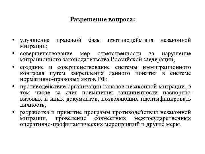 Разрешение вопроса: • улучшение правовой базы противодействия незаконной миграции; • совершенствование мер ответственности за нарушение миграционного законодательства Российской Федерации; • создание и совершенствование системы иммиграционного контроля путем закрепления данного понятия в системе нормативно-правовых актов РФ; • противодействие организации каналов незаконной миграции, в том числе за счет повышения защищенности паспортновизовых и иных документов, позволяющих идентифицировать личность; • разработка и принятие программ противодействия незаконной миграции, проведение совместных межгосударственных оперативно-профилактических мероприятий и другие меры.