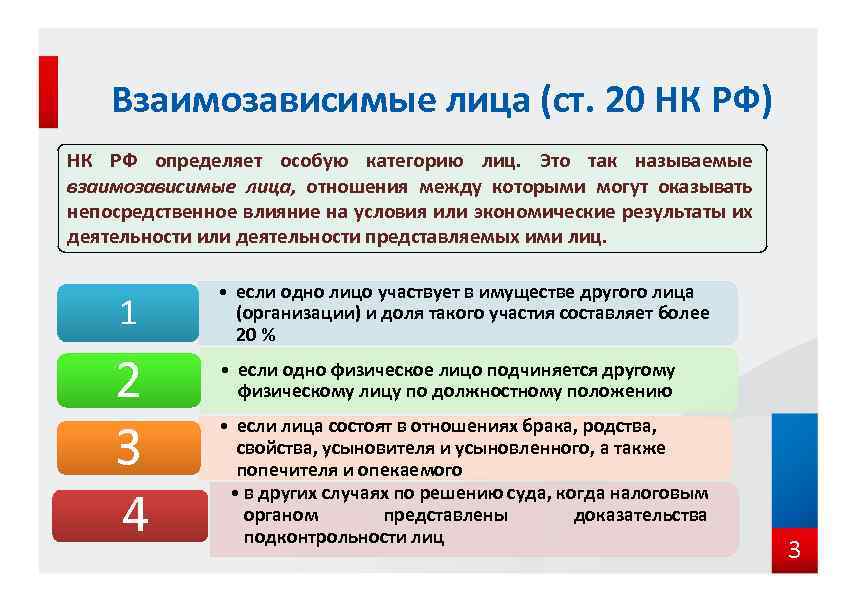 Взаимозависимые лица (ст. 20 НК РФ) НК РФ определяет особую категорию лиц. Это так называемые взаимозависимые лица, отношения между которыми могут оказывать непосредственное влияние на условия или экономические результаты их деятельности или деятельности представляемых ими лиц. 1 2 3 4 • если одно лицо участвует в имуществе другого лица (организации) и доля такого участия составляет более 20 % • если одно физическое лицо подчиняется другому физическому лицу по должностному положению • если лица состоят в отношениях брака, родства, свойства, усыновителя и усыновленного, а также попечителя и опекаемого • в других случаях по решению суда, когда налоговым органом представлены доказательства подконтрольности лиц 3