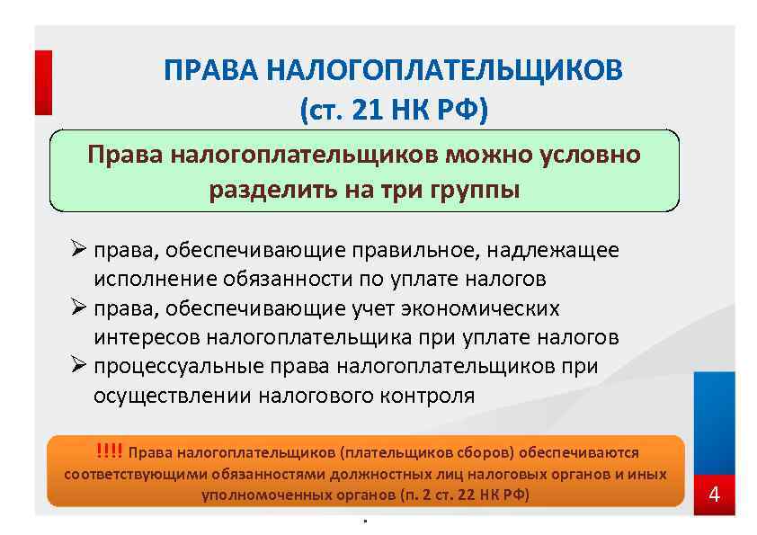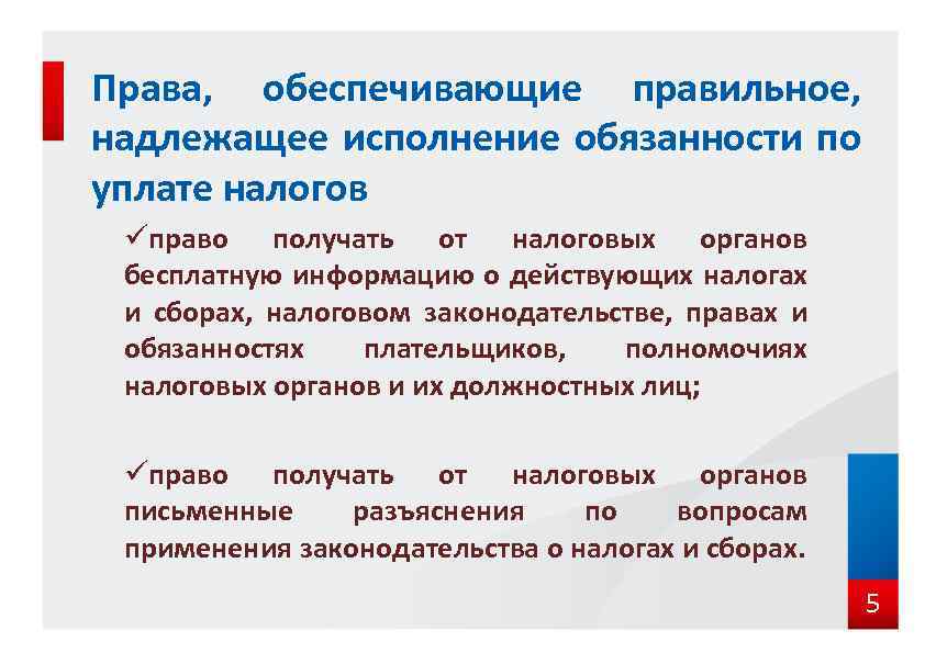 ПРАВА НАЛОГОПЛАТЕЛЬЩИКОВ (ст. 21 НК РФ) Права налогоплательщиков можно условно разделить на три группы Ø права, обеспечивающие правильное, надлежащее исполнение обязанности по уплате налогов Ø права, обеспечивающие учет экономических интересов налогоплательщика при уплате налогов Ø процессуальные права налогоплательщиков при осуществлении налогового контроля !!!! Права налогоплательщиков (плательщиков сборов) обеспечиваются соответствующими обязанностями должностных лиц налоговых органов и иных уполномоченных органов (п. 2 ст. 22 НК РФ) . 4