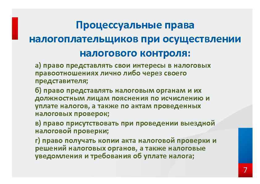 Процессуальные права налогоплательщиков при осуществлении налогового контроля: а) право представлять свои интересы в налоговых правоотношениях лично либо через своего представителя; б) право представлять налоговым органам и их должностным лицам пояснения по исчислению и уплате налогов, а также по актам проведенных налоговых проверок; в) право присутствовать при проведении выездной налоговой проверки; г) право получать копии акта налоговой проверки и решений налоговых органов, а также налоговые уведомления и требования об уплате налога; 7