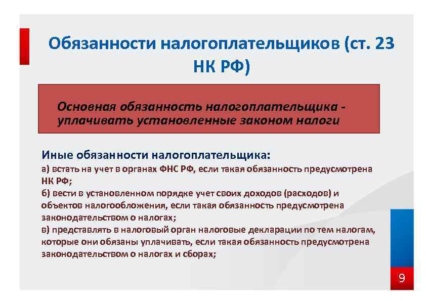 Обязанности налогоплательщиков (ст. 23 НК РФ) Основная обязанность налогоплательщика уплачивать установленные законом налоги Иные обязанности налогоплательщика: а) встать на учет в органах ФНС РФ, если такая обязанность предусмотрена НК РФ; б) вести в установленном порядке учет своих доходов (расходов) и объектов налогообложения, если такая обязанность предусмотрена законодательством о налогах; в) представлять в налоговый орган налоговые декларации по тем налогам, которые они обязаны уплачивать, если такая обязанность предусмотрена законодательством о налогах и сборах; 9